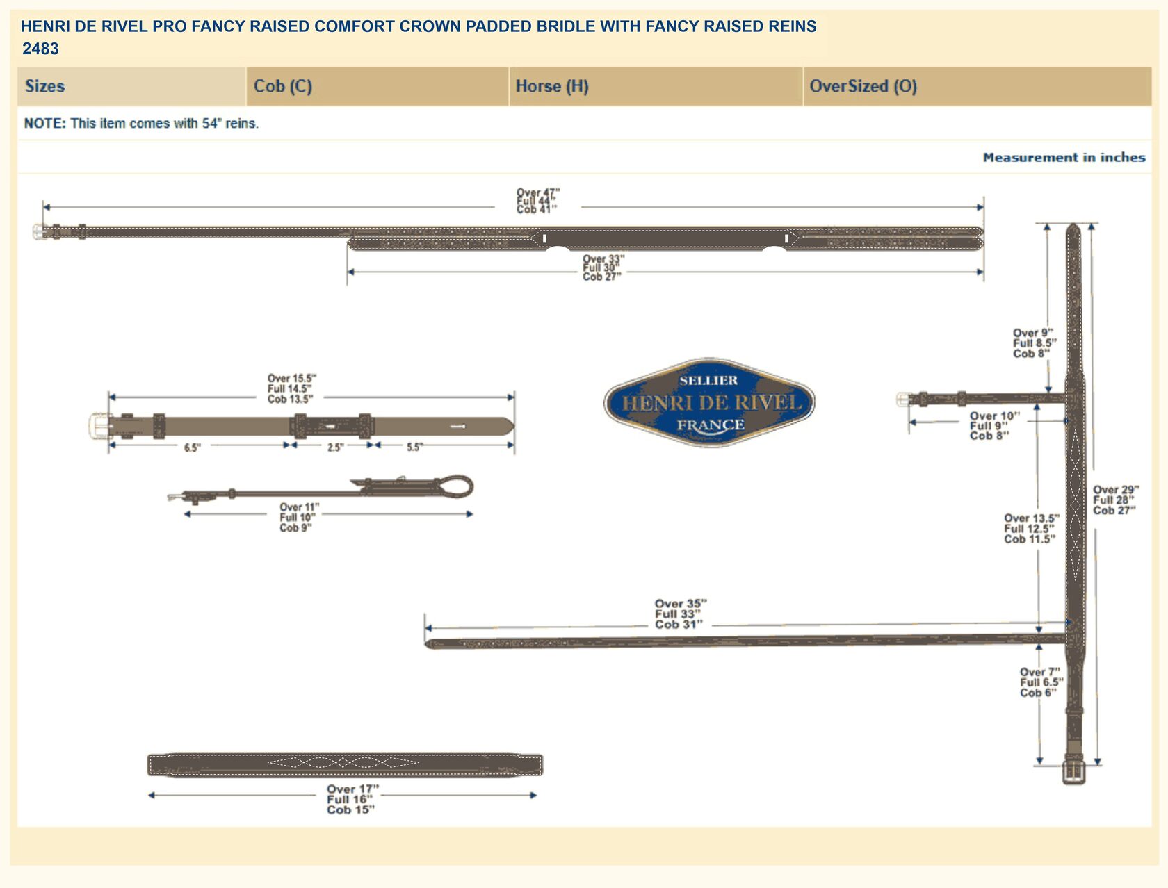 The Henri de Rivel Pro Fancy Raised Comfort Crown Padded Bridle With Fancy Raised Reins is a great choice for sensitive horses. The padded comfort crown allows for equal pressure across the poll. Classic, fancy white stitching across the brow and nose bands create a traditional design. Complete with stainless steel hardware and laced reins, this bridle is ready to use and will last for years of riding. Dimensions: 1" nose and brow bands, 1/2" cheek pieces, 5/8" reins. *Bit shown in image not included*