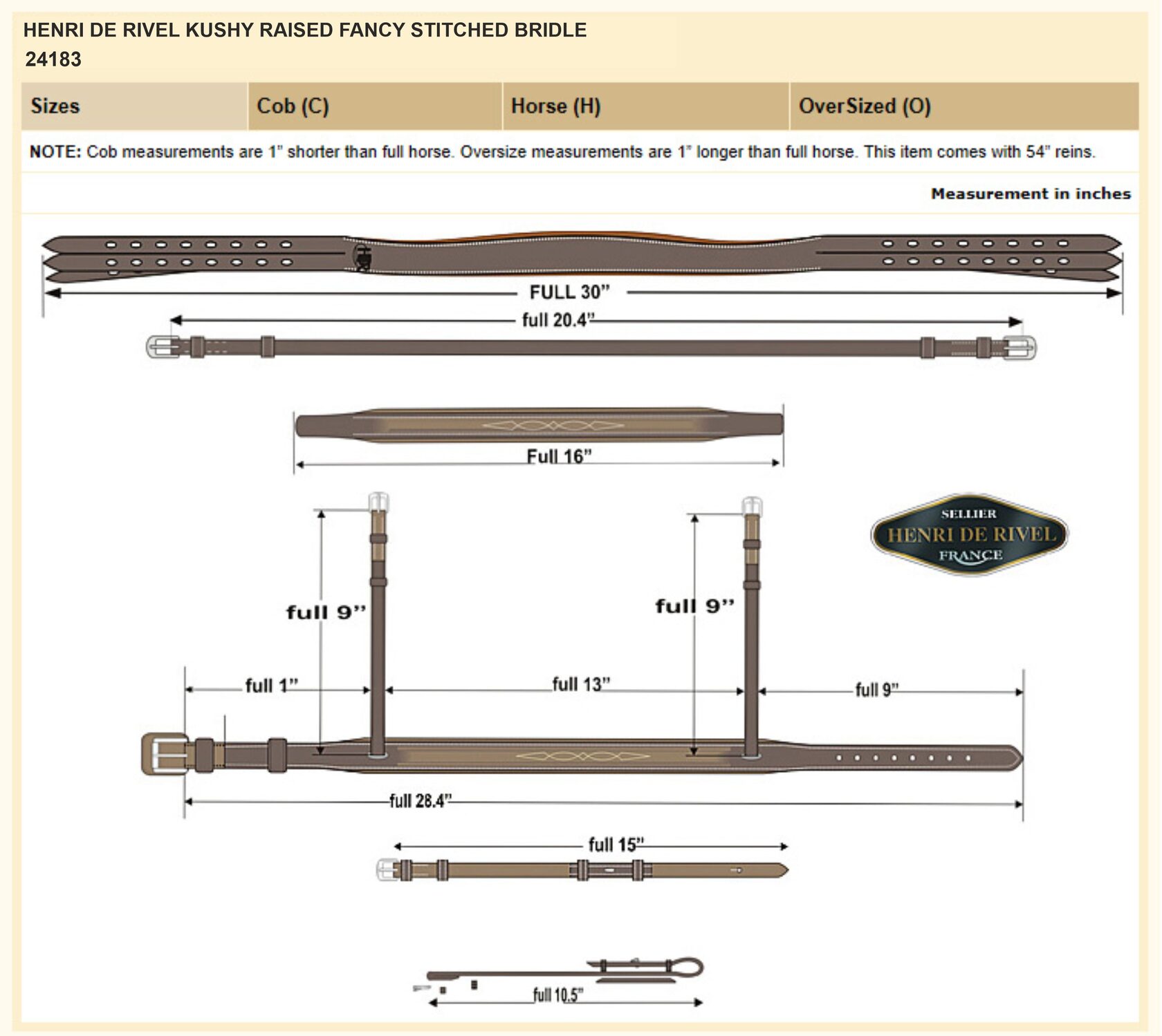 Henri de Rivel is proud to introduce the new Kushy Raised Fancy Stitched Bridle which has been designed with lightweight, soft covered leather for optimal equine comfort. This technology allows the bridle to mold your horse's head to relieve pressure and prevent chafing with minimal break in time. A mono crown piece gives additional comfort across the poll. Complete with beautiful white fancy stitching on the nose and brow bands as well as matching laced reins. Henri de Rivel offers the best and most affordable riding products, from tack to saddles. Made from quality materials and styled with attention to detail, HDR is a rider's go-to brand for strap goods.